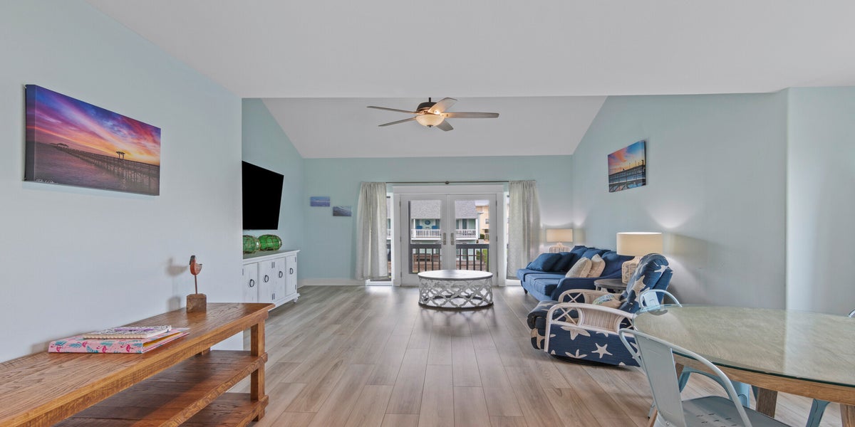 Living Area: Open concept with cozy coastal decor and direct access to the patio overlooking Little Bay